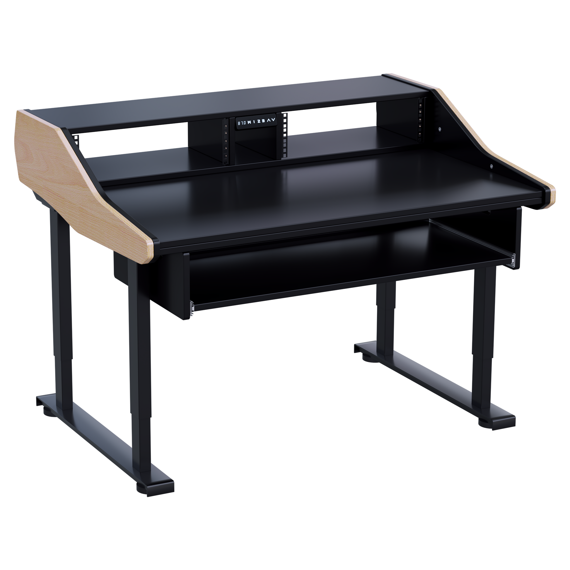 This state-of-the-art desk provides 2x3U rack space for efficient equipment storage and organization, paired with a durable four-leg design for improved stability. It features a memory function, LED touch panel, and height display for effortless adjustment. The controller is equipped with a USB-A port, making it convenient to charge devices. With its programmable memory, you can easily switch between three preset heights. A built-in collision protection feature ensures a safe and secure workspace.