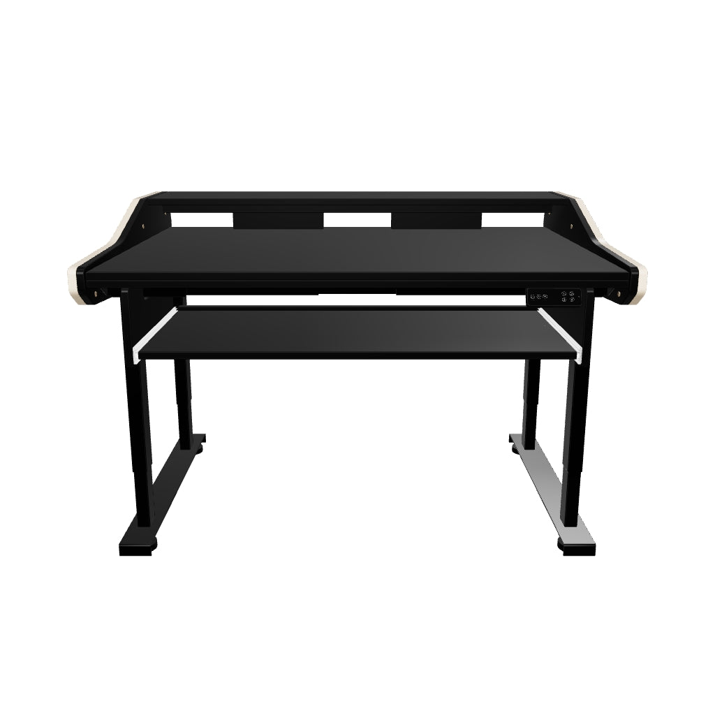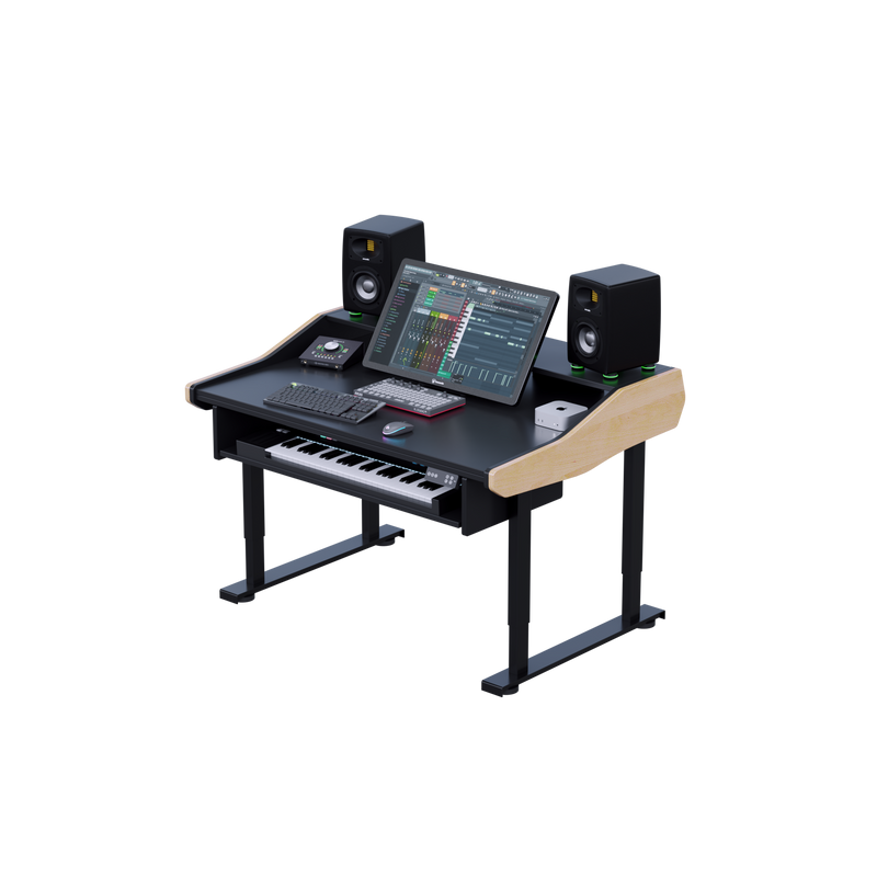 The compact workstation offers a dedicated top shelf for screens and speakers, complemented by a versatile, adjustable tray for a 61-note keyboard.