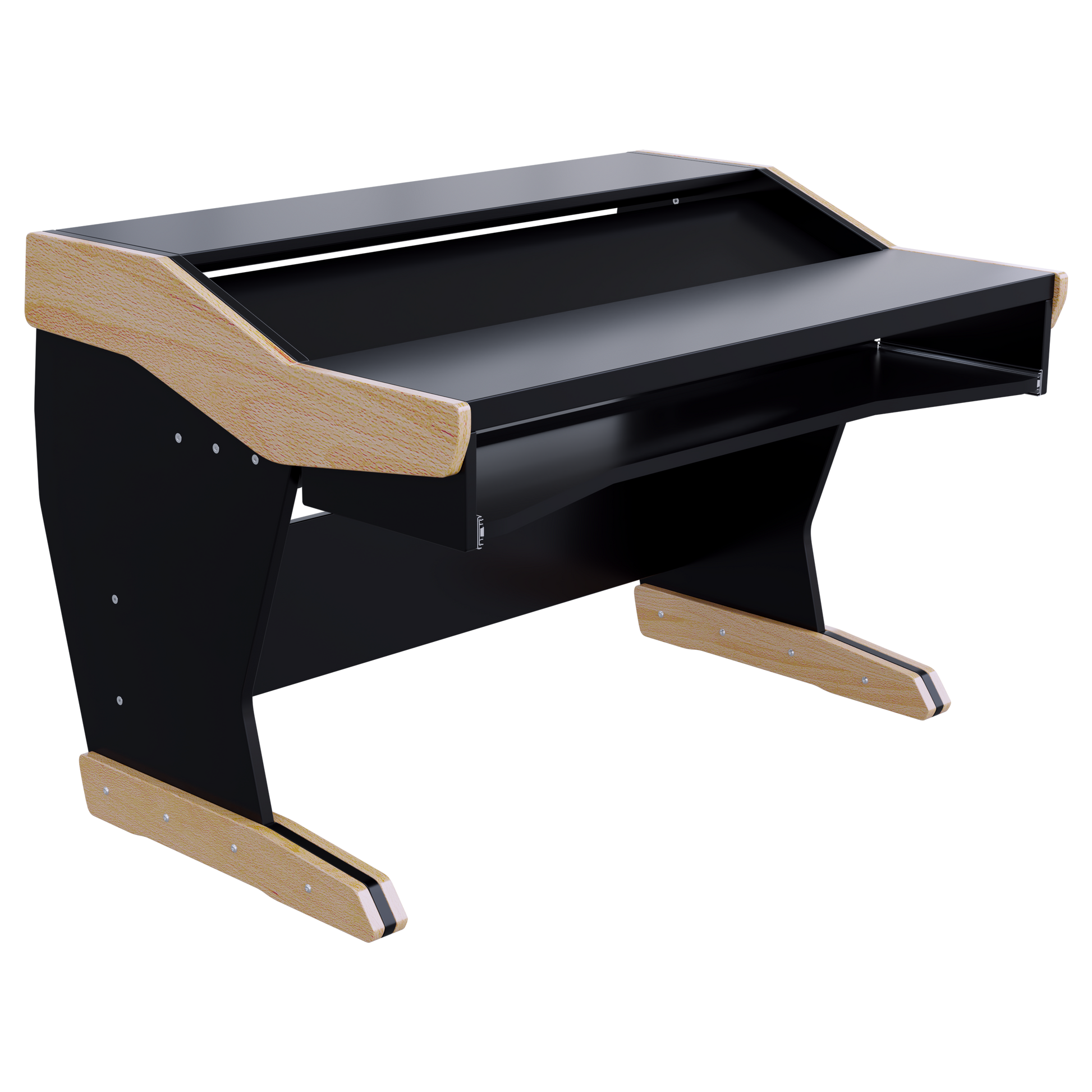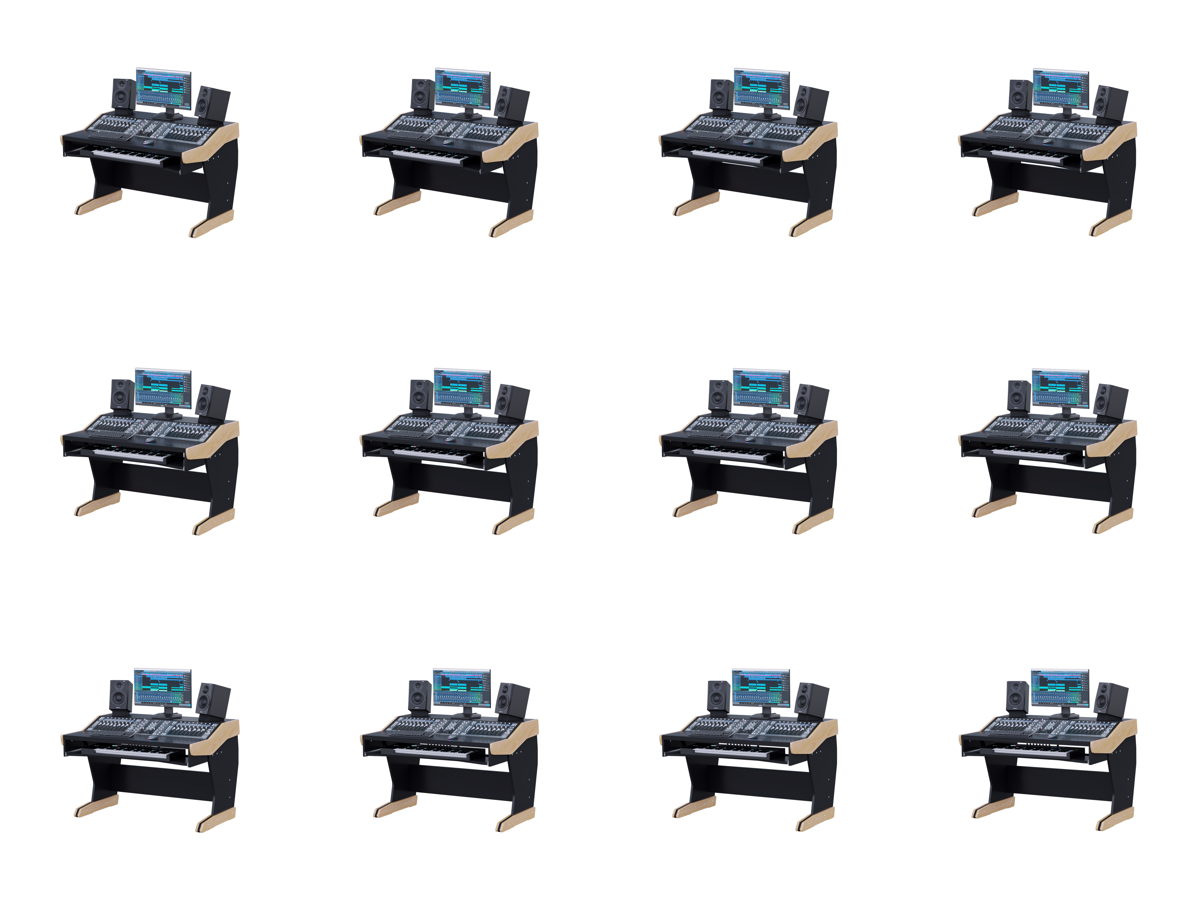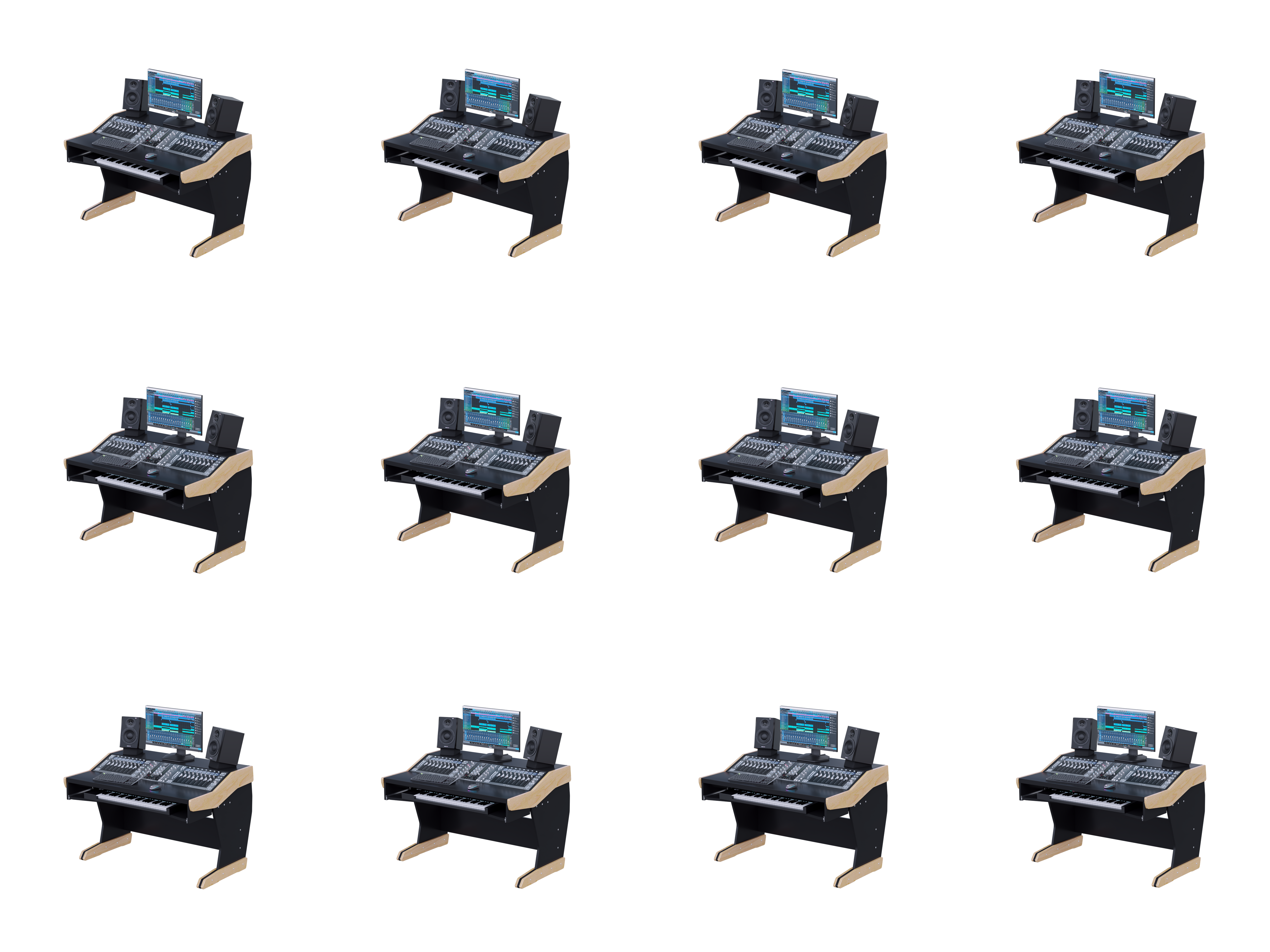 The height-adjustable keyboard tray will fit most 61-key keyboards. The adjustable desktop can be mounted at an angle or flat, making a large continuous desktop surface for best ergonomics and functionality. Can be built to different width to accommodate fewer or more controllers.